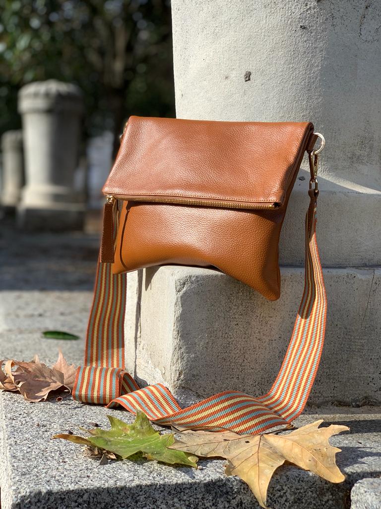 Bandolera de Piel Forro de seda Medidas : 35x22x28 cm Strap : tejido a mano con algodón orgánico( comunidad de mujeres tejedoras , zona alto andina de Perú) 110 cm.
